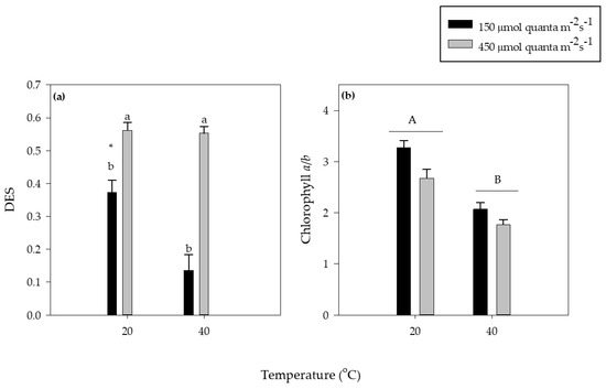 There were no changes in total carotenoid foliar content with temperature or light (Supplementary Materials Table S1). Additionally, the sum of the pigments of the xanthophyll cycle, violaxanthin (V), antheraxanthin (A) zeaxanthin (Z) did not change with light or temperature (Supplementary Materials Table S1). However, the de-epoxidation index (DES) decreased under high temperature, but this decrease was only significant under low light (150 μmol quanta m−2 s−1) (Figure 3a). As expected, DES was higher under the higher irradiance at both the temperatures tested.