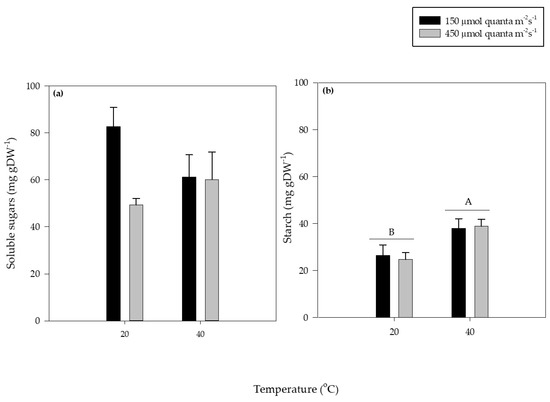 There were no significant differences among soluble sugars concentrations in C. nodosa leaves submitted to irradiance and temperature treatments (Figure 4a). However, starch concentration in those leaves was almost twice higher at 40 °C than at 20 °C (Figure 4b). Light treatments did not influence starch concentrations.