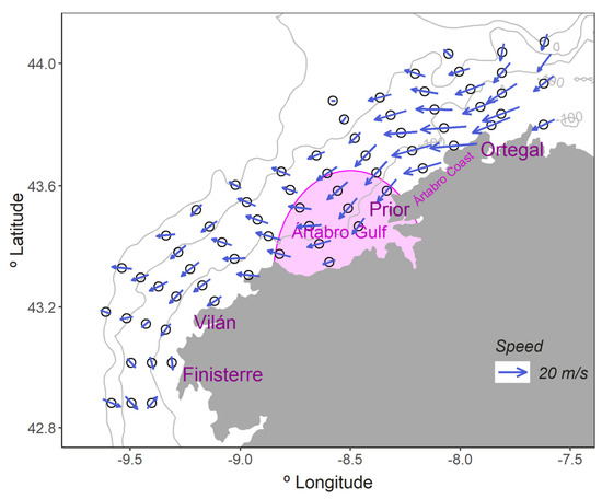 Distribution of the sampled stations (black circles). The pink-shaded area is the Artabro Gulf, an important spawning area for many commercial species. The main capes in the area are shown in magenta. Blue arrows are the geostrophic velocity of currents at each sampling station.
