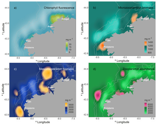 (a) Chlorophyll fluorescence, (b) microzooplankton biomass, (c) mesozooplankton biomass, (d) mesozooplankton abundance.