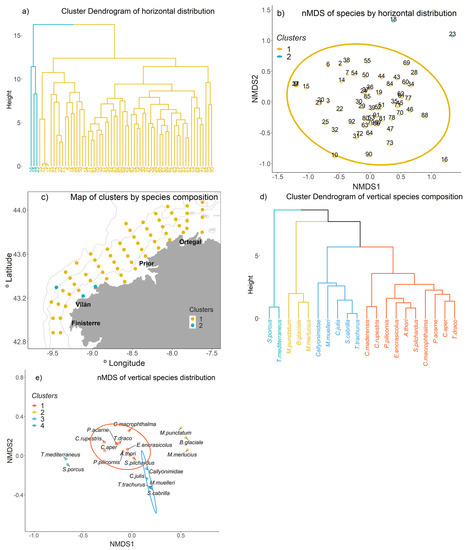 (a) Dendrogram, (b) NMDS ordination and (c) map of the clustering of the horizontal species composition, (d) dendrogram, and (e) nMDS ordination of the vertical species composition.