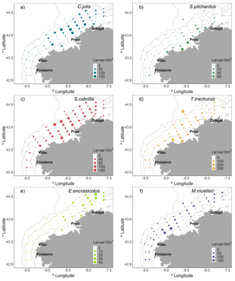 In the literature, there are some descriptions about the spawning season for some of the dominant species. The spawning period of T. trachurus begins in March–April and ends November [64], while for S. cabrilla it begins in February and ends in July in southern latitudes [65]. Regarding E. encrasicolus, its spawning season increases with decreasing latitude from Bay of Biscay to Gulf of Cádiz in April–August to April–November [66]. Sardina pilchardus has the main spawning period during October–June, peaking in December–March, but with longer duration and earlier peak at lower latitudes [67]. Unfortunately, there are no reproductive studies for most species—including C. julis, P. acarne, P. pilicornis, and T. draco in the Galician waters. Regarding the alongshore composition, there are different structures of the LFC between the northern and northwestern coasts of Galicia in the spring of 2012 [23], which were not evident in the summer. Yet, more data should be collected to obtain more robust conclusions.