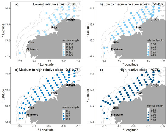 From the ontogenic point of view, the horizontal distribution of the larvae of the most abundant species did not show any trend, except for S. pilchardus which appears to be concentrated by the coast (Figure 6b). Overall, the horizontal distribution of larvae according to relative length showed that smaller larvae accumulated in the northern area, from the Artabro Coast to Cape Ortegal, while bigger larvae were distributed between Cape Vilán and Cape Ortegal and towards the slope (Figure 7).