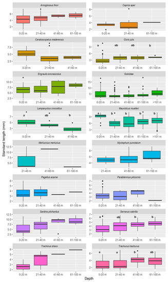 Length distribution of fish larvae at varying depths. Line: median; box: 1st and 3rd quartiles; whiskers: maximum and minimum values; black dots: outliers. The results of the Tukey post hoc test (α= 0.01) for differences in larval length of the most abundant taxa by depth are indicated by the letters a and b to define the groups that are significantly different from each other; groups sharing a letter are not significantly different.