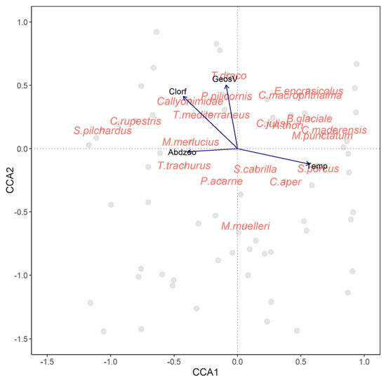 Canonical correspondence analysis (CCA) biplot for the environmental variables (arrows), larval fish taxa (red labels), and sampling stations (grey dots). Arrows indicate the relative importance (length) and correlation (angle with axis) between each variable retained in the model and the canonical axes. The significant environmental variables were temperature (Temp), zooplankton abundance (Abdzoo), and geostrophic velocity (GeosV).