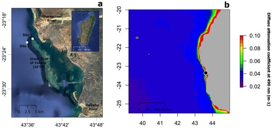 (a) Map showing the location of study sites 1 and 2 (white circles) near the Great Reef of Toliara (GRT) in SW Madagascar. (b) Annual median of the diffuse attenuation coefficient for downwelling irradiance at 490 nm in m−1 (Kd 490) for the year 2018 over the wider region (black circle indicated the location of the GRT). Satellite data derived from MODIS-Aqua accessed through OceanColor (https://oceancolor.gsfc.nasa.gov, accessed on 2 April 2019). Increasing coefficient values indicate higher water turbidity.