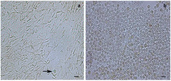 Light microscopy images of Symbiodiniaceae-like extracts obtained through the sodium hydroxide isolation method. (a) Extract from the antipatharian Cupressopathes abies showing only one Symbiodiniaceae-like cell (arrow) but abundant cnidocytes. (b) Extract from the scleractinian Seriatopora hystrix showing numerous Symbiodiniaceae-like cells, corroborating the efficiency of the isolation method. Scale bars = 10 μm.