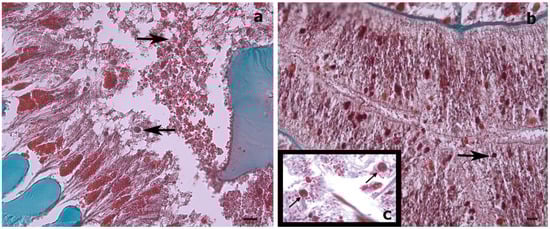 In the present study, Symbiodiniaceae-like cells were observed in the SEM and histological examination located inside the coral gastrodermis of S. maldivensis (Figure 5 and Figure 6). This suggests an endosymbiotic association, which was also suggested from histological sections analysis and from ultrastructural analysis [34,37]. The fact that no Symbiodiniaceae ITS2 sequences were amplified from the DNA extractions in this study seems most likely due to the extremely low density of dinoflagellates. In the two studies where identification was possible, different genera (Cladocopium, Gerakladium and Durusdinium) were reported to be associated with different antipatharian species [34,37]. Such plasticity, even at the intra-colony level, has also been evidenced in more recent studies on scleractinian corals and is believed to be environmentally driven [24]. Moreover, there is evidence to suggest that the same Symbiodiniaceae species may be mutualistic in one host context but opportunistic in another [50]. Therefore, the identity of the dinoflagellates alone is insufficient to determine the type of symbiosis. Further studies will be necessary to determine the nature of the association between Symbiodiniaceae and antipatharians, particularly in cases where microalgae abundance is high, as in [37].