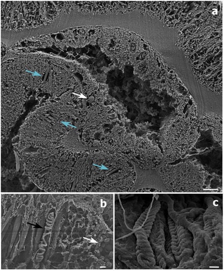 Scanning electron microscope (SEM) images of a Stichopathes maldivensis polyp. (a) A round potentially dinoflagellate-cell of about 8 μm inside the gastrodermis of the polyp gastrovascular cavity (white arrow). Numerous b-mastigophores can be observed in the ectoderm (blue arrows). (b) Smaller round cells (3–4 μm) that are likely to be mucous cells (white arrow) in the polyp ectoderm. The image also shows several b-mastigophores aligned among which one has a broken capsule which exposes the cnidocyte tubule (black arrow). (c) Closer view of spirocysts in a polyp tentacle ectoderm. Scale bars: a = 10 μm, b = 2 μm, c =1 μm.