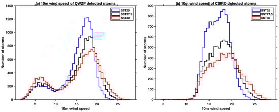 Figure 1 shows that the OWZP scheme detects more storms with lower box-averaged maximum 10 m wind speeds (i.e., lower than 10 m/s) compared to the CSIRO scheme (note that 10 m wind speed is not used as a detection criterion in the OWZP scheme and the OWZP values in Figure 1 are calculated after detection is performed). Since the resolution-dependent 10 m wind-speed criteria in the CSIRO scheme eliminates the TC detections below a threshold of 16.5 m s−1 instantaneous maximum wind speed at a grid point, we observe fewer storms with box-averaged wind speeds less than 10 m/s. In contrast, the OWZP scheme uses the thresholds of large-scale environmental conditions and does not use any thresholds of the wind speeds. Additionally, since the OWZP scheme is tuned using low-resolution reanalysis datasets, we speculate that modified thresholds obtained after tuning using high-resolution reanalysis could remove some of these detections with weaker intensities. In this study, we remove the OWZP storms below a limit of box-averaged lifetime maximum 10 m/s wind speed for further analysis of TCs (i.e., we used the numbers in data column three of Table 1) to remove the secondary peak in the bi-modal distribution of intensities shown in Figure 1a and focus on the arguably more realistic, more intense storms. In addition, Figure 1 shows an increase in the number of intense storms with increasing SSTs using both the OWZP and CSIRO schemes. We further estimate the mean annual number of OWZP detected storms for each of the constant SST experiments (Table 1). The SST25 experiment is considered as the control experiment, for which we found a global mean number of 3218 TCs. By increasing the temperatures for the SST27.5 and SST30 experiments, we observe a decrease in the global mean annual TC detections, with 2929 and 2923, respectively. Similarly, using the CSIRO scheme, we found 2277 TCs for the SST25 experiment and decreasing numbers for the SST27.5 and SST30 runs, with 1808 and 1586, respectively. The increased detections in all the three constant SST experiments using the OWZP scheme compared to the CSIRO scheme are like those found in a current climate simulation using the ACCESS 1.3 model, which also gives higher detections using the OWZP scheme (Raavi and Walsh 2020a [3]). Using the OWZP scheme (column 3 of Table 1), we observe a decrease in the frequency of TCs by 12% when increasing the SST from 25 to 27.5 °C and a 15% reduction when increasing the SST from 25 to 30 °C. In contrast, the CSIRO scheme has a more significant decrease of 21% and 30% by increasing the SSTs from 25 to 27.5 and 30 °C, respectively. Overall, we observe a reduction in the genesis frequency with increasing SSTs using both tracking schemes.