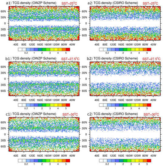 Figure 3 shows that there is a high density of TCs at polar latitudes. Similar results were found by Chavas and Reed (2019) [17]. In explaining this result, Chavas and Reed (2019) [17] hypothesized that the polar cap region was analogous to an f-plane region, where cyclones dominate. Previous work (e.g., Emanuel 1986 [12]; Chavas and Emanuel 2014 [28]) found that tropical cyclone size scaled approximately with the ratio of potential intensity to the Coriolis parameter. The simulations show higher values of potential intensity for higher SSTs, so in a polar region densely packed with TCs, larger storms might also be fewer, which could be a potential explanation for the results in Figure 3 and Figure 4. Chavas and Reed (2019) [17] found a maximum formation rate at about 30 degrees latitude for their aqua-planet, uniform insolation experiments. We also find a local maximum at 30 degrees of latitude using the OWZP detection scheme (Figure 3), but poleward of this, the genesis density increases. One significant difference in our simulations from those of Chavas and Reed (2019) [17] is that we do not have uniform insolation but keep insolation at terrestrial values. This may be assisting formation at higher latitudes in our results compared with those of Chavas and Reed (2019) [17].