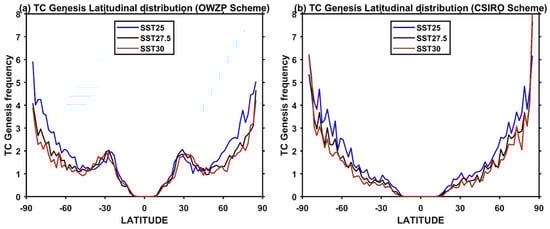 Latitudinal distribution of genesis frequency per 2-degree latitude box for the three constant SST experiments using (a) the OWZP and (b) CSIRO detection schemes.