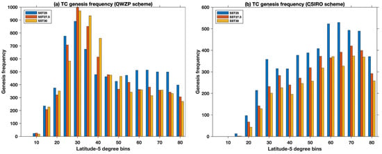 The TC frequency per 2-degree latitude box gradually increases from the subtropics to the poles using both tracking schemes, with some differences at specific latitudes. Merlis et al. (2016) [33] also noted that there is an increase in the TC frequency towards the poles in a constant SST GCM simulation. When comparing the overall TC detections in different latitude bands, the OWZP scheme has a higher number of TCs in the tropics (Figure 4) compared to the CSIRO scheme. As the resolution-dependent CSIRO scheme uses a threshold of 16.5 m s−1 instantaneous grid point wind speed to remove TCs below this threshold, we observe fewer TCs using this scheme compared to the OWZP scheme. The reduced number of TCs using the CSIRO scheme across this 0–25° latitude band is due to the higher 10 m wind speed threshold, whose value in the CSIRO scheme is set to be consistent with the resolution of the model. There are a higher number of detections in mid-latitudes and poles compared to the terrestrial climate simulations using both the detection schemes, perhaps due to more favorable conditions for TC formation within the aqua-planet simulations. On examining the changes in the genesis frequency between different SST experiments, both the OWZP and the CSIRO show a decrease in genesis at 0–25° latitudes with increasing SSTs. In addition, the OWZP scheme detects an increase in genesis at 25–40° degrees of latitude, showing a shift in the genesis towards the poles with increasing temperatures (Figure 4). These results agree with the earlier study by Merlis et al. (2016) [33], using uniform SSTs, who showed a decrease in frequency and a shift in the genesis locations towards the poles with increasing SSTs. At higher latitude bands (40–60° and 60–90°), both tracking schemes show a decrease in the TC frequency with increasing temperature (Figure 4).