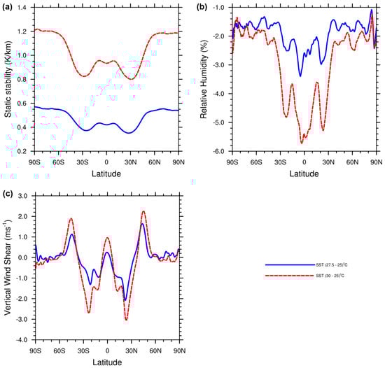 To understand the differences in the genesis frequency between different latitude bands, we have calculated the large-scale environmental conditions at the time of the TD genesis in developing cases (Day 0, as shown in Figure S1) for the OWZP storms for each of the latitude bands. Figure 7 and Figure 8 show the mean environmental conditions around the TD center for all three SST experiments. These plots give insight into the typical environment near the center of developing TDs for varying latitudes and SST values. Of all the variables, we observe that the saturation deficit and stability parameters show the most significant differences (greater than 95% significance level using two sample Student’s t-tests) between the three simulations. That is, with an increase in SST, we observe an increase in the stability of the atmosphere (Figure 7). The stability values also show an increasing trend with latitude, with the polar regions having higher values compared to the other latitude bands in all the three experiments. This rising trend of stability with latitude is accompanied by increasing precipitation towards poles in these sets of simulations, as also shown in Figure 3 of Walsh et al. (2020) [10]. We speculate that higher values of precipitation lead to the release of the latent heat flux during the condensation process that increases the temperatures of the upper atmosphere, thereby stabilizing the atmospheric column. This increased stability with increased upper tropospheric temperature leads to a decrease in the frequency of storms at higher latitudes. Similarly, the saturation deficit increases with increasing temperatures across all the latitude bands. In contrast, Figure 7 only shows prominent differences in RH between about 0° and 40° latitude, with the SST25 experiment having higher relative humidity compared to the SST27.5 and SST30 experiments. Therefore, with increasing temperature, there is a global increase in the stability and saturation deficit of the atmosphere, both of which are more unfavorable for TC formation.