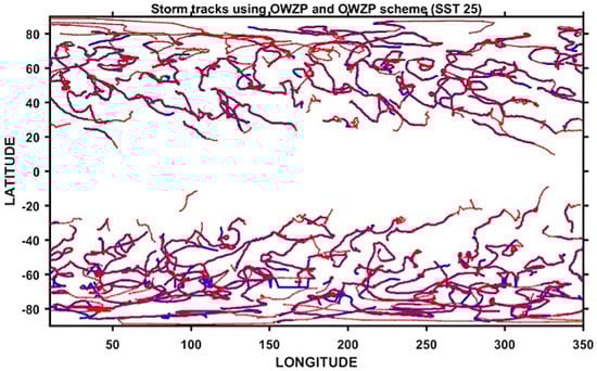 The OWZP scheme has a higher number of storms with a more prolonged duration, whereas the CSIRO scheme gives shorter-duration storms. This can be seen in Figure 6 and Figure S5. The lifetime of TCs in the same model forced with interannually varying AMIPII SSTs (Kanamitsu et al., 2002 [58]) for the period 1990–2009 shows that the CSIRO scheme-detected storms have a shorter duration compared to the OWZP detected storms (Raavi and Walsh, 2020a [3]). Raavi and Walsh (2020a, [3]) note that the CSIRO scheme-detected TC tracks are a subset of the OWZP scheme-detected tracks. To identify whether the CSIRO tracks are a subset of the OWZP tracks in these aqua-planet simulations, we have considered a particular month (August) in the year 1990 for the SST25 experiment and plotted individual tracks of TCs detected by both the schemes. Figure 6 shows that CSIRO tracks are a subset of OWZP tracks for the SST25 simulation with shorter tracks. Similar results are observed in the other two constant SST experiments (not shown). The TC tracks in these simulations show that genesis from the OWZP scheme occurs mostly in the subtropics, and in both tracking schemes, the TCs move poleward and westward. The poleward movement of the TCs is mainly due to the beta-drift mechanism caused by the presence of the latitudinally varying Coriolis force in these simulations [66,67,68].