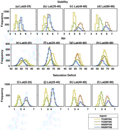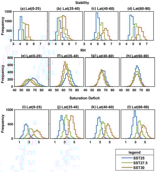Histograms of mean values of stability parameter (a–d; K/km); RH (e–h; %) and saturation deficit (i–l; kg/kg) for OWZP-detected developing TCs at Day 0 (TD genesis in developing cases) within a 12-degree box region around the circulation center in all three constant SST experiments.