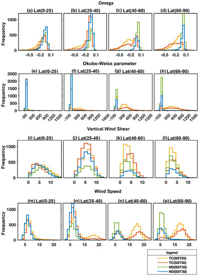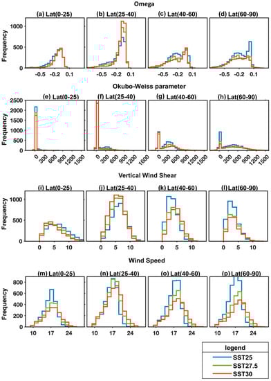 Nevertheless, other variables appear to show more agreement with the latitudinal variation in TC formation shown in Figure 4. For instance, Figure 8 shows that for developing TDs poleward of 55°, omega values are generally more negative (higher upward mass flux) for increased SSTs, Okubo–Weiss parameter values are generally more positive, and there is greater wind shear, while Figure 4 shows that at these latitudes, there is lower TC formation for higher SSTs. The 850 hPa OW parameter shows a similar latitudinal distribution with increased SST to that of omega. There is also a gradually increasing trend in its magnitude with increasing latitude. This implies that TDs at genesis in the low latitudes have lower values of the OW parameter compared to the storms in higher latitudes. The higher values of the OW at the higher latitudes (defined here as poleward of 40 degrees latitude) have enhanced vertical stability of the atmosphere compared to the lower latitudes, indicating that as stability increases, the vortices need to have stronger vorticity for genesis to occur. This also means that the vortices that have weaker strength, indicated by weaker values of the low-deformation vorticity, do not develop into TCs, and may become non-developing cases. Therefore, there may be a reduction in the formation of the weaker strength vortices in the more stable atmospheric conditions.