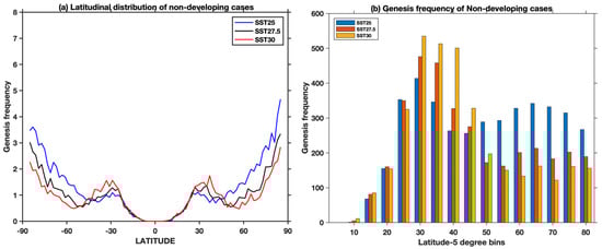 Latitudinal distribution of genesis frequency of non-developing depressions at Day 0, detected using the OWZP detection scheme for the three constant SST experiments: (a) distribution per 2-degree latitude box; and (b) in 5° latitude bands.
