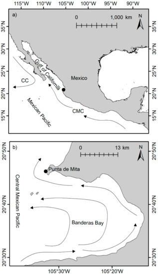 - Pantoja, D.A.; Marinone, S.G.; Parés-Sierra, A.; Gómez-Valdivia, F. Numerical modeling of seasonal and mesoscale hydrography and circulation in the Mexican Central Pacific. Cienc. Mar. 2012, 38, 363–379. [Google Scholar] [CrossRef]