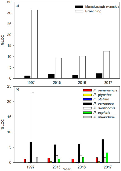 - Guzmán, H.M.; Cortés, J. Changes in reef community structure after fifteen years of natural disturbances in the Eastern Pacific (Costa Rica). Bull. Mar. Sci. 2001, 69, 133–149. [Google Scholar]