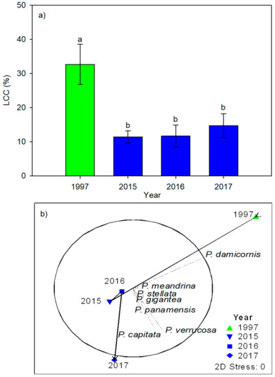 | ETP Site | Years Surveyed | ENSO Event * | Pre-ENSO % LCC | Post-ENSO % LCC (% Mortality) | % LCC After Recovery | Reference |