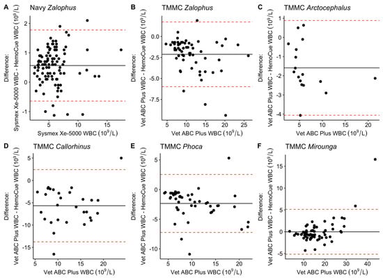 Bland-Altman plots comparing the corrected WBC counts between the comparative analyzers and the HemoCue® WBC system for each species. (A) Bland-Altman plot of U.S. Navy Marine Mammal Program California sea lion (Zalophus californianus) samples comparing the Sysmex Xe-5000 automated hematology analyzer to the HemoCue® WBC system. The Sysmex Xe-5000 WBC count is depicted on the x-axis. The difference between the Sysmex Xe-5000 WBC count and the HemoCue® WBC system WBC count is depicted on the y-axis. The solid black line indicates the overall bias, and the red dashed lines indicate the upper and lower limits of agreement. (B) Bland-Altman plot of The Marine Mammal Center (TMMC) Zalophus samples comparing the Vet ABC Plus automated hematology analyzer to the HemoCue® WBC system. The Vet ABC Plus WBC count is depicted on the x-axis. The difference between the Vet ABC Plus WBC count and the HemoCue® WBC system WBC count is depicted on the y-axis. (C) Bland-Altman plot of TMMC Guadalupe fur seal (Arctocephalus townsendi) samples comparing the Vet ABC Plus automated hematology analyzer to the HemoCue® WBC system. (D) Bland-Altman plot of TMMC Northern fur seal (Callorhinus ursinus) samples comparing the Vet ABC Plus automated hematology analyzer to the HemoCue® WBC system. (E) Bland-Altman plot of TMMC Harbor seal (Phoca vitulina) samples comparing the Vet ABC Plus automated hematology analyzer to the HemoCue® WBC system. (F) Bland-Altman plot of TMMC Northern elephant seal (Mirounga angustirostris) samples comparing the Vet ABC Plus automated hematology analyzer to the HemoCue® WBC system.