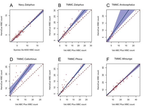 and the HemoCue®WBC System are (109/L). (A) Passing-Bablok regression of the U.S. Navy Marine Mammal Program California sea lion (Zalophus californianus) samples comparing the Sysmex Xe-5000 to the HemoCue® WBC system. The WBC count from the Sysmex Xe-5000 is depicted on the x-axis. (B) Passing-Bablok regression of The Marine Mammal Center (TMMC) Zalophus samples comparing the Vet ABC Plus automated hematology analyzer to the HemoCue® WBC system. The WBC counts from the Vet ABC Plus are depicted on the x-axis. The WBC counts from the HemoCue® WBC system are depicted on the y-axis. (C) Passing-Bablok regression of TMMC Guadalupe fur seal (Arctocephalus townsendi) samples comparing the Vet ABC Plus automated hematology analyzer to the HemoCue® WBC system. The WBC counts from the Vet ABC Plus are depicted on the x-axis. The WBC counts from the HemoCue® WBC system are depicted on the y-axis. (D) Passing-Bablok regression of TMMC Northern fur seal (Callorhinus ursinus) samples comparing the Vet ABC Plus automated hematology analyzer to the HemoCue® WBC system. The WBC counts from the Vet ABC Plus are depicted on the x-axis. The WBC counts from the HemoCue® WBC system are depicted on the y-axis. (E) Passing-Bablok regression of TMMC harbor seal (Phoca vitulina) samples comparing the Vet ABC Plus automated hematology analyzer to the HemoCue® WBC system. The WBC counts from the Vet ABC Plus are depicted on the x-axis. The WBC counts from the HemoCue® WBC system are depicted on the y-axis. (F) Passing-Bablok regression of TMMC.