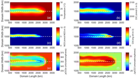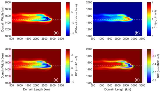 The control run examined the ocean’s response to the idealized hurricane at the surface and subsurface. The tight coupling of the marine physical and biogeochemical systems was evident in the model solutions. Model results show an asymmetric (right-hand biased) upwelling of cold water and nutrients DIC and NO3 (Figure 4a–c). The greatest upwelling occurred on the right side of the storm’s track. Upwelled nutrients stimulated new phytoplankton growth, as indicated by chlorophyll (chl) concentration, which by Day 8 was an order of magnitude larger than the initial concentration (Figure 4d). The chl concentration is highest around the 2800 km length mark where the full-strength storm first enters the study domain. This is because phytoplankton in this area have more time to react to the storm passage and assimilate nutrients that are upwelled than those further to the left/west.