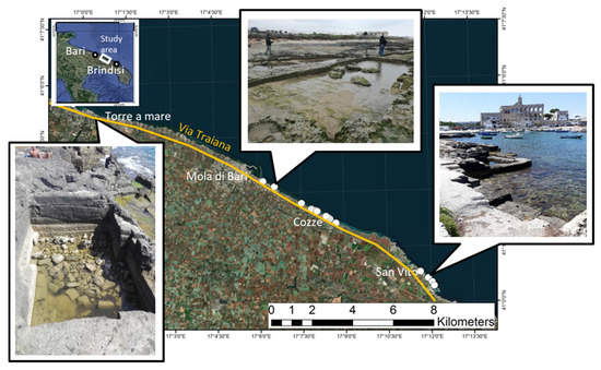 Along the coastal stretch extending from Bari to Monopoli, adjacent to the old Via Traiana that connected Benevento to Brindisi, there are various archaeological features, from Roman quarries and fish farming pools to drainage channels (Figure 1). Some of these features are now partially submerged but during the Roman times they were at an elevation higher than the current sea level [11]. Several coastal quarries are located at a horizontal distance of 10 m from the current coastline, while at the time of their use they were located about 50 m from the coastline [11,40].