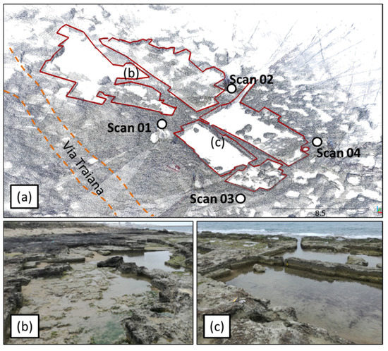 Topographic survey at Mola di Bari; (a) TLS point cloud of the coastal quarries of Mola di Bari with the delimitation of the main architectural elements that define their functional height; (b) quarries carved in the proximity of the Via Traiana; (c) quarries connected to the sea through a drainage channel.