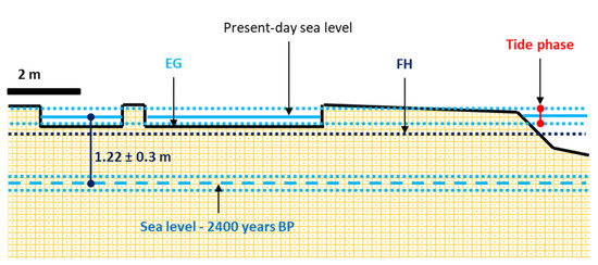 Sea-level assessment in 2400 years BP compared to the current sea-level measured in the coastal quarries of Mola di Bari; EG = elevation of a geoarchaeological marker, FH = functional height.