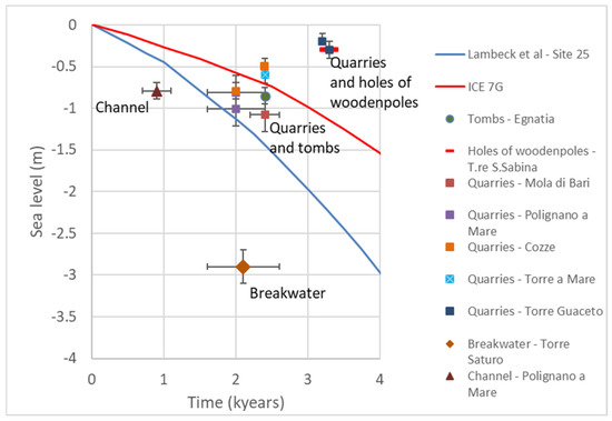 The definition of the sea level based on the functional height of an investigated archaeological marker can be used to calibrate the proposed sea-level models. In Figure 8, position data related to the geoarchaeological markers located along the coast of the Apulia region are compared with two relative sea-level curves obtained from (i) the isostatically corrected sea-level positions proposed by Lambeck et al. [2] for the investigated coastal sector (Site 25—Latitude 41.245 N, Longitude 16.507 E Greenwich), and (ii) the ICE-7G model [3,5] for the Southern Adriatic area (Latitude 41.341 N, Longitude 17.150 E Greenwich).