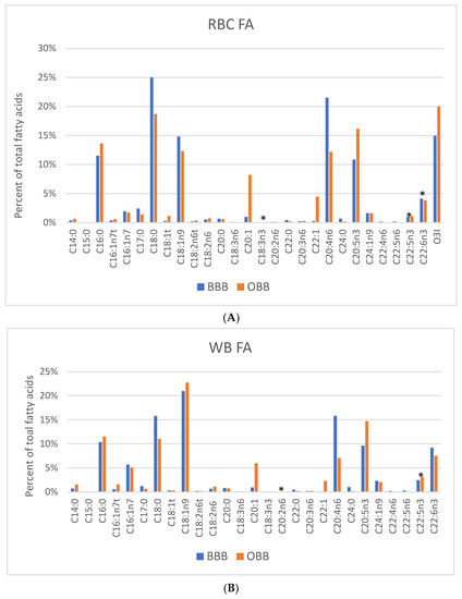 In total, 26 FAs, plus O3I, were measured in RBCs, plasma, and WB; and 27 FAs (including 15:0) were measured in blubber for BBB and OBB groups (see Supplemental Table S1 which also includes the FA composition of average OBB diet). The mean values for blood-derived FAs that constituted ≥1% of total FAs for each sample type are presented in Figure 1. Although the levels of many FAs were statistically significantly different between BBB and OBB, a few were markedly different for RBC, WB and plasma. These included (for all three sample types) the LC-MUFAs [20:1n9,11 (eicosenoic and gadoleic acids) and 22:1n9,11 (erucic and cetoleic acids)], and the LC-PUFAs, ARA and EPA. The RBC levels of the two LC-MUFAs (20:1 and 22:1) were much higher in the OBBs compared with the BBBs (20:1, 8.2% vs. 1.0% and 22:1, 4.5% vs. 0.2%, respectively). RBC EPA was higher in OBBs compared with BBBs (16% vs. 11%), whereas the reverse was true for RBC ARA (OBB 12% vs. BBB 22%; Figure 1 and Table S1).