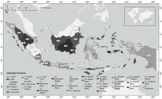 The study area of this paper is the entire territory of Indonesia and its 34 provinces (Figure 1). The Archipelago of Indonesia is located between the Indian Ocean and the Pacific Ocean, thus, parts of Indonesia’s waters experience influences from both oceans. Indonesia has the second-longest coastline (108,000 km [21]) in the world after Canada (202,080 km [22]). The inner Indonesian waters have seabeds ranging from very shallow waters of less than 50 m at the western Sunda shelf to more than 3000 m deep, particularly in the eastern Sahul shelf. Many parts of the Archipelago have strong currents, e.g., the waters around the Komodo National Park in East Nusa Tenggara (Figure 1, at the western tip of province #23). The waters between Bali (Figure 1, province #2) and Lombok (Figure 1, at the western tip of province #22) also have strong currents due to the presence of the Indonesian Throughflow that flows through the Lombok Strait towards the Indian Ocean [23]. Consequently, many parts of the Indonesian waters have high productivities, inviting the cetaceans to utilise the areas. The Archipelago has more than 17,500 islands [21], many of them in remote areas in eastern Indonesia, thus, presenting challenges to the rapid response to any stranding events.