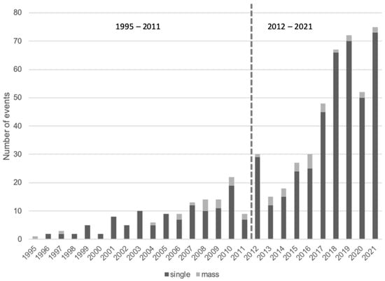 Our dataset contains 26 years of data (1995 to 2021) collected by Whale Stranding Indonesia from various sources acknowledged in the Whale Stranding Indonesia website. The information caused reporting bias because most data points were based on reports instead of generated by observers actively scanning beaches regularly for stranding events. Since more reporting has been observed as the stranding network became more active, we considered the need to divide the analysis between a period when the stranding network had not been established and a period following its establishment.