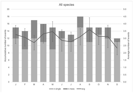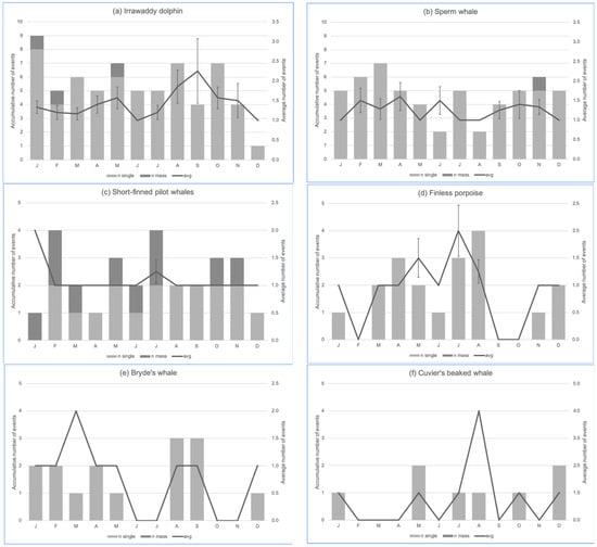 The monthly trend of stranding events of the six most frequently stranded cetaceans in Indonesia: (a) the Irrawaddy dolphin (Orcaella brevirostris, n = 102), (b) sperm whale (Physeter macrocephalus, n = 75), (c) short-finned pilot whale (Globicephala macrorhynchus, n = 31), (d) Indo-Pacific finless porpoise (Neophocaena phocaenoides, n = 24), (e) Bryde’s whale (Balaenoptera edeni, n = 16), (f) Cuvier’s beaked whale (Ziphius cavirostris, n = 11). Some species had stranding data with no associated months; thus, the cumulative counts may be less than the total events for each species. Bryde’s whale and Cuvier’s beaked whale charts have no measure of dispersion because se = 0.