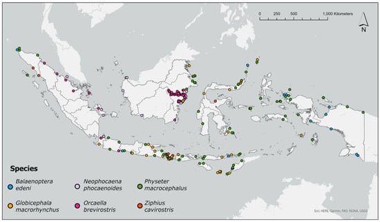 Species-specific cetacean strandings of six species in Indonesia 1995–2021. The stranding distributions of other species are available in the http://www.whalestrandingindonesia.com/map.html (accessed on 1 February 2022).