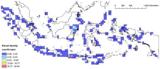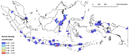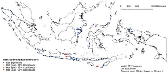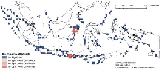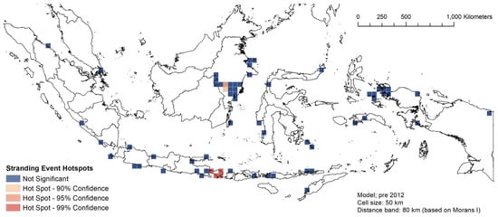All strandings were plotted using ArcGIS 10.6 (ESRI Inc., Redlands, CA, USA) to investigate the spatio-temporal patterns of the stranding events. Following Betty et al. [25], several distance classes were tested (increments from 5, 15, 20, 50, 100, 150, and 200 km) to understand if stranding locations were dispersed, random, or clustered, resulting in 50 km as the best distance class for subsequent analyses. A kernel density analysis [26,27] was used to examine the spatial pattern of stranding marine mammals in Indonesia with a distance of 50 km. We then used the Global Moran’s Index spatial autocorrelation highest z-score (an indication of clustering patterns [28]) to decide the fixed distance bands for pre-2012 (200 km) and 2012 onward (100 km), in order to eventually evaluate the spatial autocorrelation patterns of our stranding events for each model.