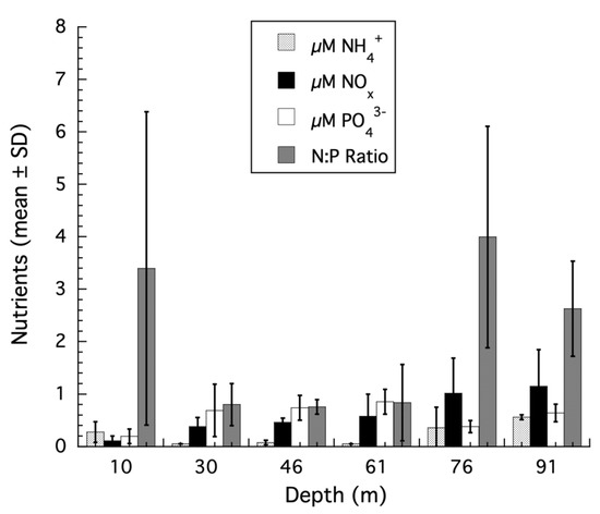 Nutrient concentrations from shallow to mesophotic depths using discrete sampling from 10, 30, 46, 61, 76, and 91 m (n = 3 per depth, mean ± SD) were collected from the shallow and mesophotic reefs of Bock Wall, Lee Stocking Island, Bahamas and returned to the laboratory where they were immediately filtered using GF/F filters. The seawater filtrate was frozen, transported to the University of New Hampshire (UNH), and analyzed for nitrate/nitrite (NOx) and ammonium (NH4+) and soluble phosphate (PO43−) using high throughput colorimetric assays on a Smartchem Chemistry Analyzer at the UNH Water Quality Analysis Laboratory. Nitrogen:phosphorus ratios (N:P) were calculated using the combined NOx and NH4+ concentrations. The NOx data were previously published in Morrow et al. (2016) [45], while the PO43− and ratio data are published here for the first time.