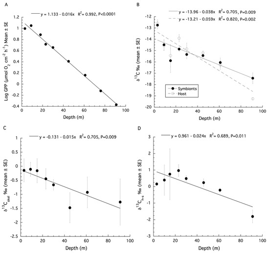 (A) Changes in gross primary production (GPP) (mean ± SE) with increasing depth for colonies of Montastraea cavernosa. (B) Changes in bulk tissue stable δ13C isotopes (mean ± SE) for the host and symbiont of M. cavernosa with depth. (C) Changes in stable δ13C isotopes (mean ± SE) for the skeleton of M. cavernosa with depth. (D) Changes in δ13Ch–s (mean ± SE) for colonies of M. cavernosa with depth.