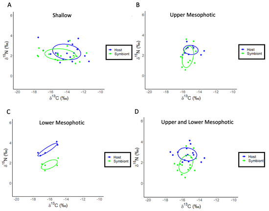 SIBER analysis for Montastraea cavernosa to assess isotopic niche width. Blue dots represent coral host tissues, while green dots represent symbionts. Dotted lines represent convex hulls which are highly sensitive to sample size, and solid lines represent standard ellipse areas of overlap corrected for sample size (SEAC). (A) Shallow samples of M. cavernosa. (B) Upper mesophotic samples of M. cavernosa. (C) Lower mesophotic samples of M. cavernosa. (D) Upper and lower mesophotic samples of M. cavernosa combined.