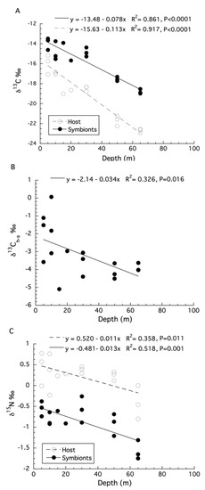 (A) Changes in bulk tissue stable δ13C isotopes for the host and symbiont compartments of Stylophora pistillata with depth. (B) Changes in δ13Ch–s for colonies of S. pistillata with depth. (C) Changes in stable δ15N isotopes for the host and symbiont of S. pistillata with depth.