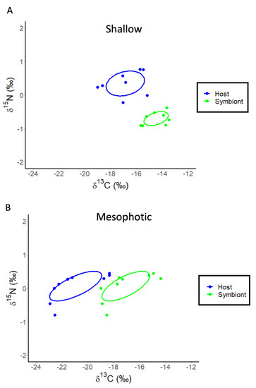The re-analysis of the stable isotope data for Stylophora pistillata from Einbinder et al. (2009) [44] using linear regression showed that the δ13C values of both the host fraction (ANOVA: F1,16 = 165.02, p < 0.0001, R2 = 0.92, Figure 4A) and the symbiont fraction (ANOVA: F1,16 = 14.37, p < 0.0001, R2 = 0.86, Figure 4A) become increasingly negative with increasing depth. The calculation of δ13Ch–s showed a significant decrease with depth (ANOVA: F1,16 = 7.26, p = 0.016, R2 = 0.33, Figure 4B). For δ15N, there is also a significant effect of depth for the host fraction (ANOVA: F1,16 = 8.35, p = 0.011, R2 = 0.36, Figure 4C) and symbiont fraction (ANOVA: F1,16 = 16.14, p = 0.001, R2 = 0.52, Figure 4C) but not for δ15Nh–s (ANOVA: F1,16 = 0.25, p = 0.620, R2 = 0.02). The SIBER analysis of these data shows that the host and symbiont compartments for both shallow (5, 10, 15, and 20 m) (Hotelling’s T2 = 95.9, F = 38.94, p < 0.001) and mesophotic (30, 50 and 65 m) samples of S. pistillata occupy significantly (Hotelling’s T2 = 38.49, F = 16.04, p < 0.001) different (0.0% overlap) isotopic niches (Figure 5A,B).