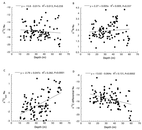 The SIA data for Agaricia lamarki are limited because the separation of the symbiont from the host compartments was not conducted [48]. There were two sites used to collect samples along different depth ranges with no measurements of irradiance for these sites. Moreover, measurements of the δ15N of the sediments were not significantly different between sites, and the ANCOVA analysis for the δ13C values of dissolved inorganic carbon (DIC) from the water column does not meet two requirements of an ANCOVA: a significant linear regression of δ13C DIC with depth for both locations, and homogeneity of their slopes (see Figure S4 in Laverick et al. (2019) [48]). This appears to be the case for several of the analyses presented (see SIA panels Figure 1 in Laverick et al. (2019) [48]). Because these designated site characteristics were not significantly different between sites (see Figure 3 in Laverick et al. [48]), the data for the two sites are analyzed together here. Linear regression showed no significant effect of depth on the δ13C values (ANOVA: F1,98 = 1.28, p = 0.259, R2 = 0.013, Figure 6A) or δ15N values (ANOVA: F1,98 = 0.93, p = 0.337, R2 = 0.009, Figure 6B) for the holobiont. Significant depth effects for δ13C values of the coral skeleton (ANOVA: F1,98 = 38.95, p < 0.0001, R2 = 0.282, Figure 6C) were observed. In what appears to be a correction for the kinetic effects observed in Figure 6C, the skeletal δ13C values were subtracted from the holobiont δ13C values [48]. The resulting data, known as the tissue “δ13C differential”, reportedly represents the long-term photosynthetic activity of corals at each depth (i.e., metabolic effects) and does show a significant decrease with increasing depth (ANOVA: F1,98 = 38.95, p < 0.0001, R2 = 0.282, Figure 6D). All data used here can be found in the supplemental files from Laverick et al. [48].