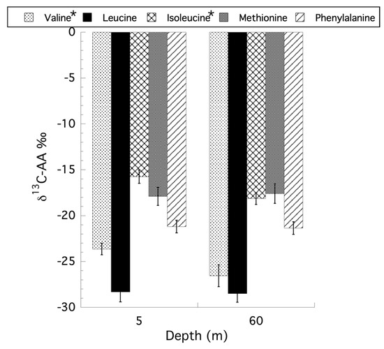 Changes in δ13C values for the CSIA amino acid analysis of valine, leucine, isoleucine, methionine, and phenylalanine for samples of Stylophora pistillata from 5 and 60 m. * indicates significant differences between depths for specific amino acids (p < 0.5).