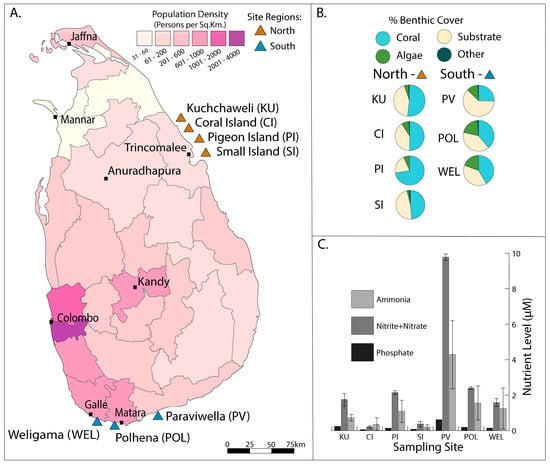 Overview of Sri Lanka administrative boundaries, status of benthic cover and water chemistry of sampling sites located in the northeastern and southern administrative districts. (A) Map of Sri Lanka highlighting major cities, including the district boundaries shown in lines, which were used for administrative purposes. Districts are the second level administrative divisions of Sri Lanka, preceded by provinces. Sri Lanka has 25 districts organized into 9 provinces. Coral reef sites have brown triangles for the northeast and blue triangles for the south. The population density by districts shows that the northeast coral reefs studies fall inside the Trincomalee District belonging to the eastern province, the 2nd lowest population density range representing 61–200 persons per square kilometer. Reef sites in the south are represented by the Hambantota, Matara with a southern province population density 601–1000 persons per square kilometer. (B) Percent cover of benthic communities at each reef sample site in Sri Lanka. Percent live coral cover around Sri Lanka ranged from 16.5% at Paraviwella reef (PV) to 69.8% at Pigeon Island (PI); the mean across all sample sites (mean ± SD) was 43.8 ± 17.2%. The percent algae cover ranged from 6.4% at Small Island (SI) reef to 14.9% at Weligama reef (WEL). The algal cover was lower in the northeast (ranging from 6.4 to 10.46%, mean ± SD 8.5 ± 1.6%) than in the south (ranging from 10.1 to 14.9%, mean ± SD 12.6 ± 2.4%). Weligama reef (WEL) and Polhena reef (POL) in the south belong to Matara District. Paraviwella reef site (PV) in the south belongs to Hamabnatota District. (C) Inorganic nutrients measured at each site when samples for all reef sites were studied. The PV reef is exposed to untreated sewage outflow and is in close proximity to a fishing harbor. POL and WEL reefs were found closer to estuaries receiving catchment from the Nilwala and Polwaththe Rivers, respectively.