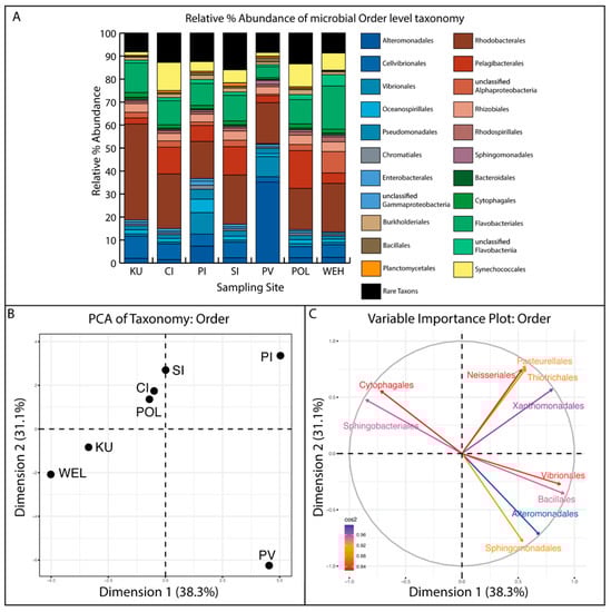 A Principal Coordinate Analysis (PCA) and Variable Importance plot of order-level taxonomy was performed and identified the 10 most influential taxonomic orders across all sites (arrows in Figure 2C). Sites POL, CI and SI clustered separately from sites KU and WEL (Figure 3B). Paraviwella reef (PV) and Pigeon Island reef (PI) were the most disparate along both component 1 and 2 and clustered independently of all other sites. Figure 3B depicts the top 10 most important orders as they relate to the coral reefs in ordination space. Order Alteromonadales was the most important driver of reef clustering, illustrated by its cos2 value of nearly 1. The orders Sphingobacterales and Cytophagales were negatively correlated with orders Alteromonadales and Vibrionales and were the most important factors for clustering of five out of the seven reefs sampled.