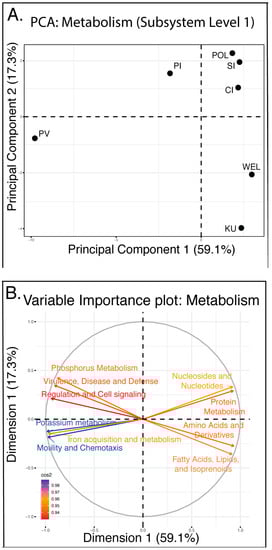 A Principal Coordinate Analysis (PCA) and Variable importance plot of function were performed (Figure 3A,B). Function data were based on SEED subsystem level 1, which has 30 categories and 1358 annotated subsystems. Each reef site had reads corresponding to all metabolic categories, except for “Plant cell wall and outer surfaces”. In the resultant PCA plot, samples from coral reefs at Polhena (POL), Small Island (SI), Pigeon Island (PI) and Coral Island (CI) clustered together near the upper right quadrant; this grouping was mainly driven by Protein Metabolism and Nucleosides & Nucleotides. The cluster of Weligama reef (WEL) and Kuchchaweli reef (KU) in the lower right quadrant was significant based on SIMPROF (Figure 3) and was driven by the metabolism of aromatic compounds, lipid metabolism and amino acid metabolism. Most dissimilar to any other reef was Paraviwella reef, whose position at the far left was due to this reef possessing higher relative abundances of functions such as motility and chemotaxis and the stress response pathways.