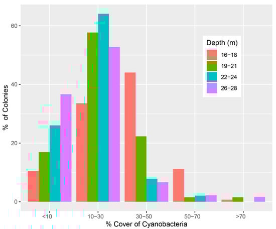 Percentage of antipatharian (black coral) colonies at the SS Yongala with different percentages of turf algae and cyanobacteria coverage, across four depth ranges from the top of the wreck to the sea floor. The total number of colonies from all depths was used to estimate the percentage of colonies at each depth range. For brevity, only ‘Cyanobacteria’ is written on the x-axis label, referring to both cyanobacteria and turf algae.