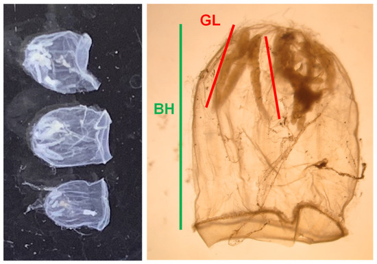 Picture on specimens of Aglantha digitale (left) and their measured body parts: bell height (BH) and gonad length (GL) (right).